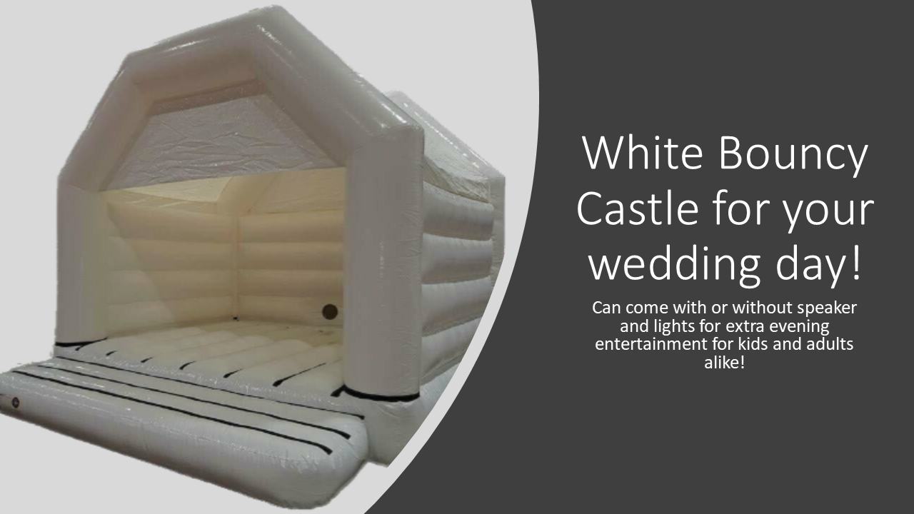 Introducing for this Summer our all white glossy wedding castle - perfect for venues with outside space you need to fill with fun for all - we can provide this staffed for £250 for 3 hours. Can hire for longer if requested at extra charge.