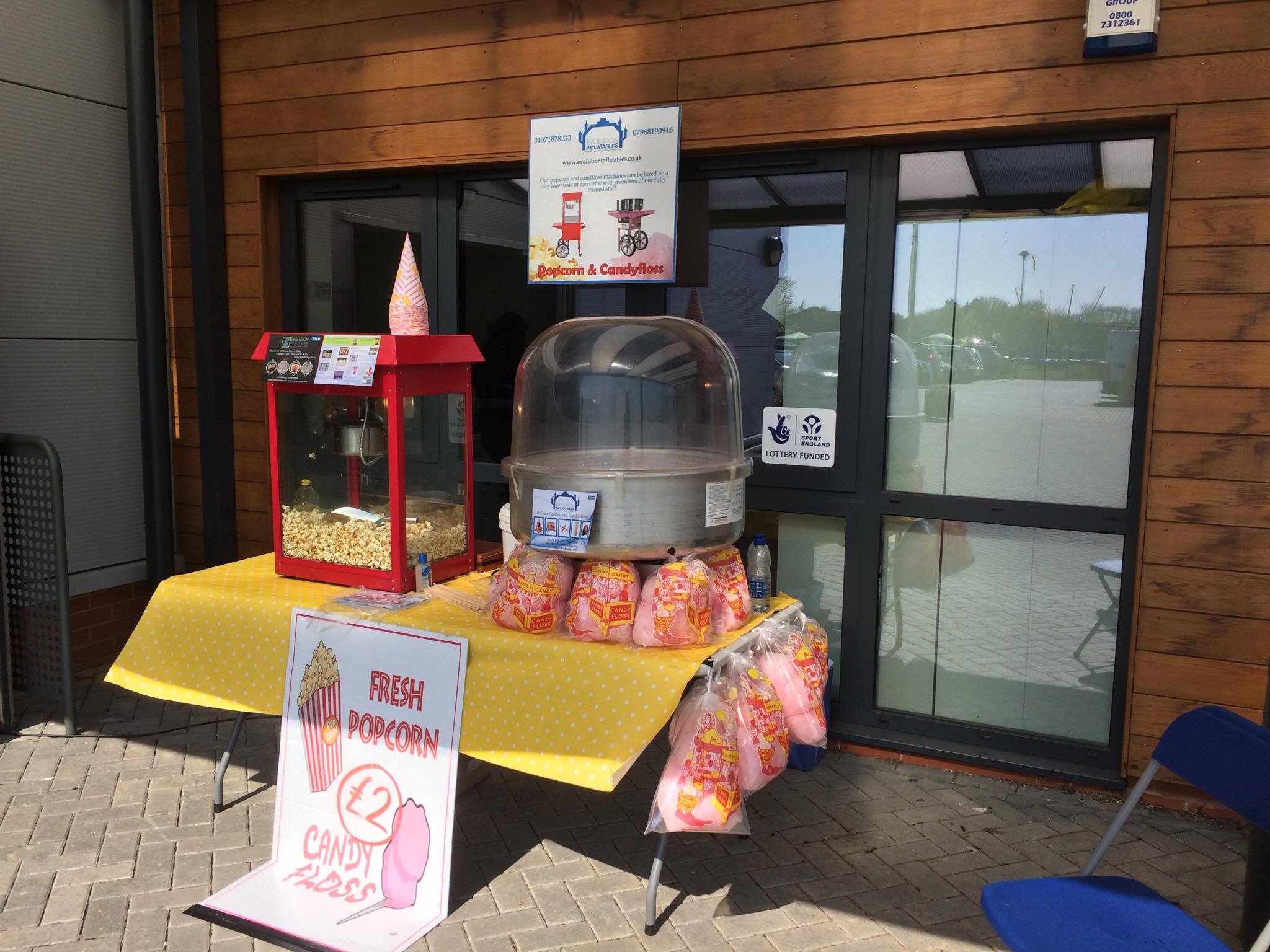 Alongside our inflatables and other event equipment we can also bring and sell popcorn, candy floss, hot and cold drinks and slushies to festivals, fetes, events. We will then give a profit to your event or charity. Call the office on 01371 878233 for more details.