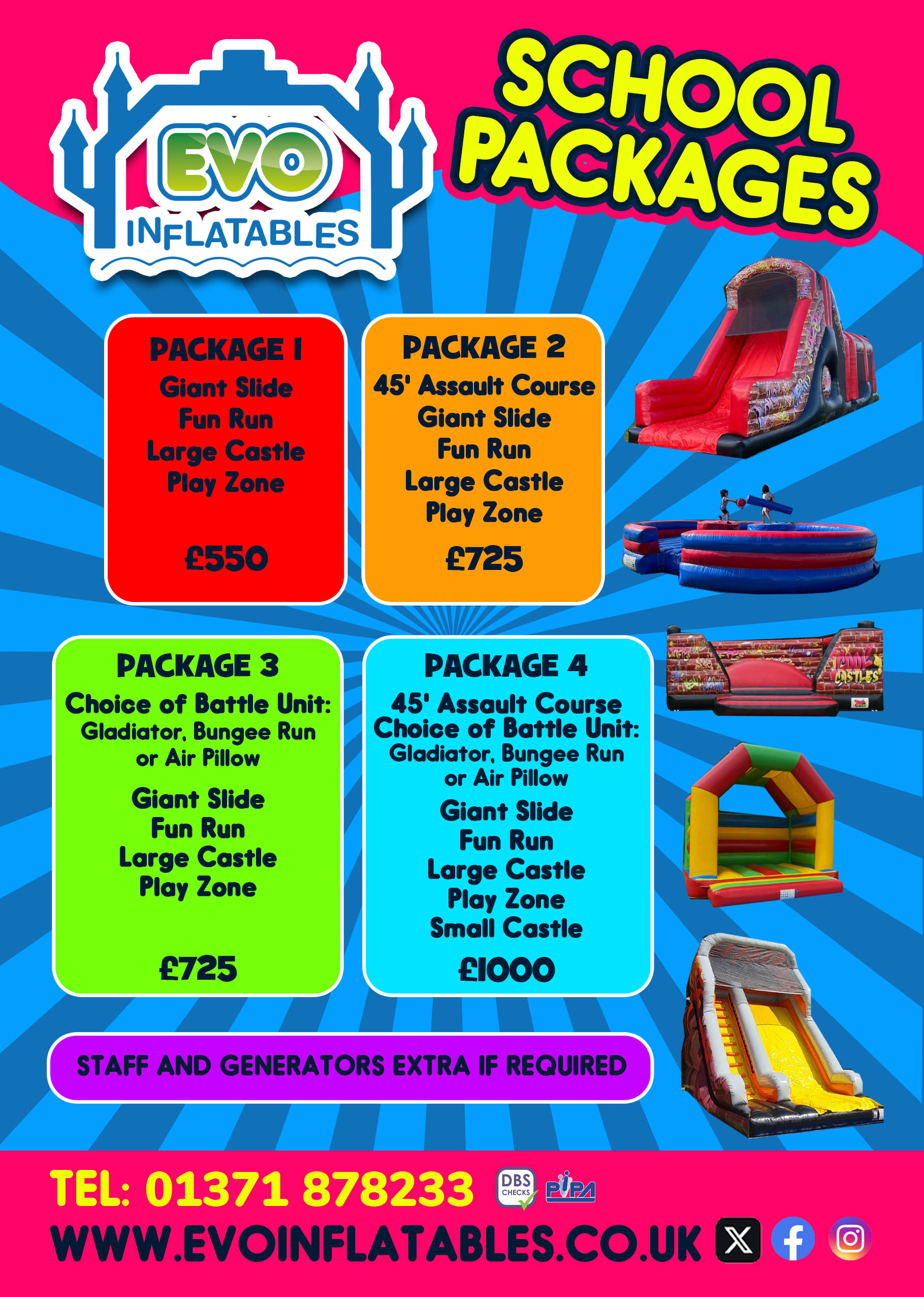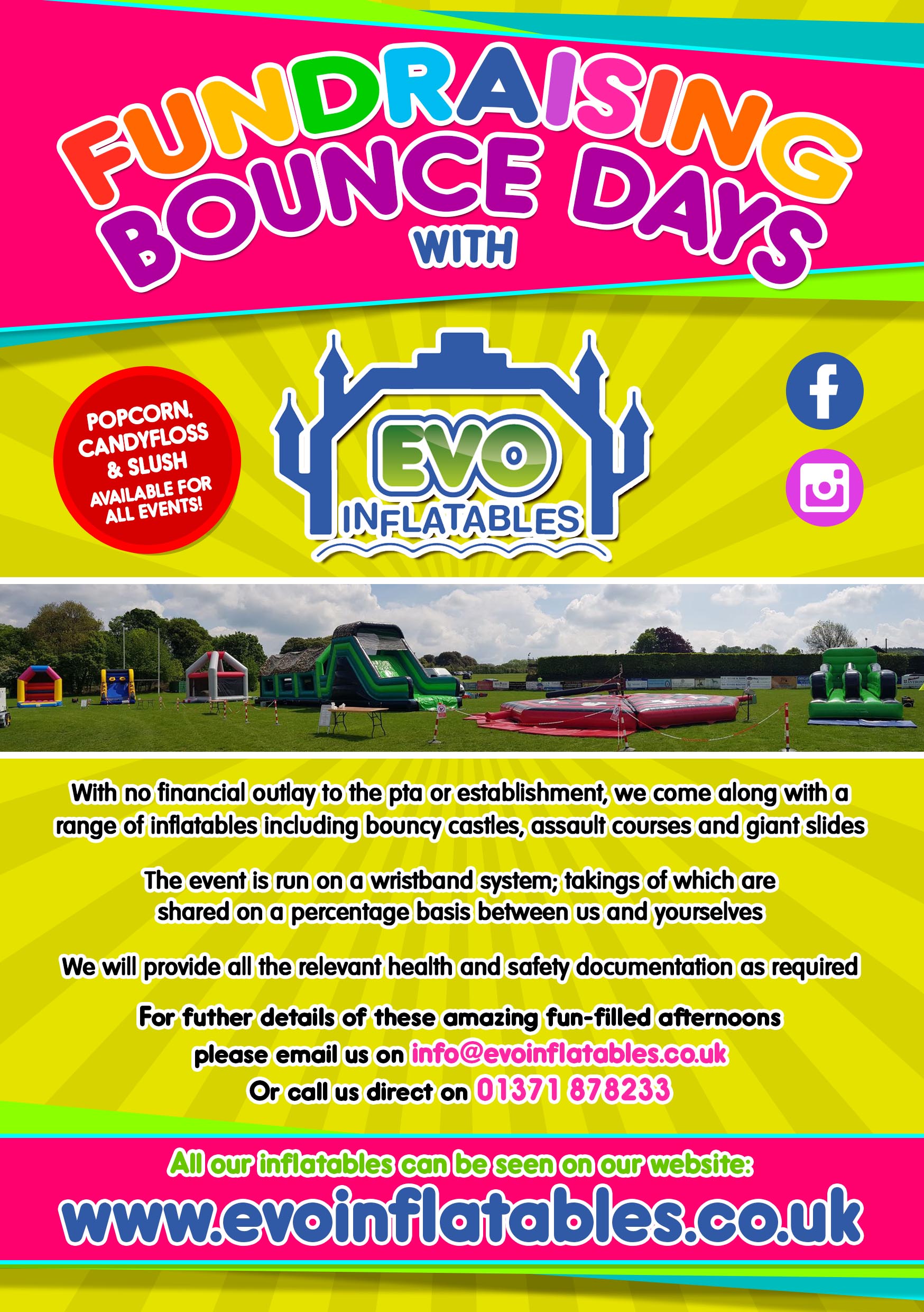 At no cost to school or PTA we can also run a Fundraising Bounce Day. We can bring a selection of inflatables, depending on size of your school, and run a 2 hour after school (typically on a Tuesday to Thursday) wristband bounce zone with percentage of profits contributing to the school. This will depend on numbers at the school and will take place usually on an afternoon after school from 3 - 5 pm! Give us a call to discuss more on 01371 878233.