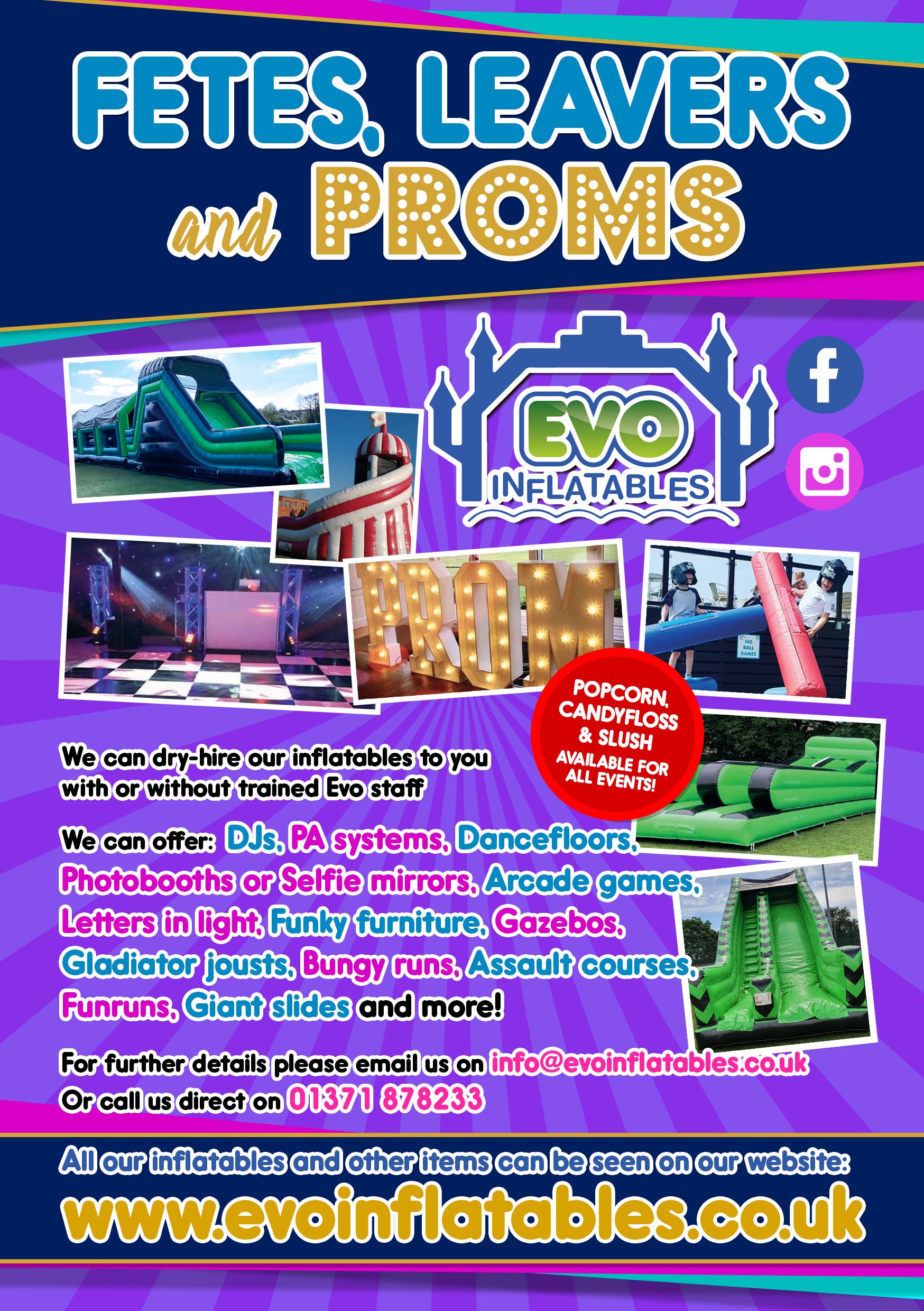 For Leavers events and Proms we can also dry hire our inflatables to you with or without trained staff. Alongside this we also offer discos, dance floors and letters in light to add a touch of sparkle to the event. See our other websites Evo DJs and Evo Event Hire.